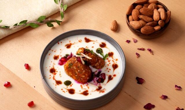 ● Garnish with tamarind, green chutney, pomegranate, chilli powder, roasted cumin powder, roasted almond, and coriander leaves